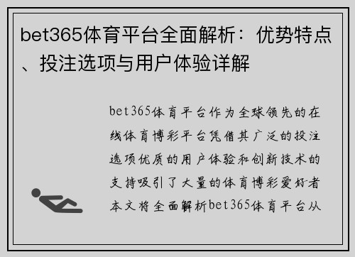 bet365体育平台作为全球领先的在线体育博彩平台,凭借其广泛的投注选项、优质的用户体验和创新技术的支持,吸引了大量的体育博彩爱好者。本文将全面解析bet365体育平台,从其优势特点、投注选项、用户体验等方面展开详细讨论。我们将分析该平台如何凭借丰富的体育赛事、实时直播、快速支付以及安全保障,提供无与伦比的博彩体验。同时,我们也将对比其他平台,探讨bet365在用户服务、界面设计等方面的独特优势。本文将分为四个主要部分,帮助读者全面了解bet365体育平台。